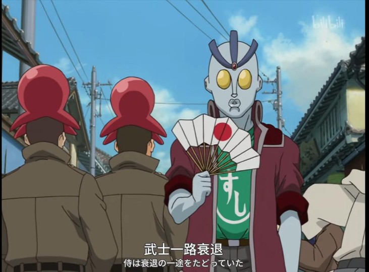 因为你很快就发现另一疑点——《银魂》中角色的日常生活场景与现代日本无二。除了东京仍叫“江户”,所有事件和主要人物都有对应历史原型,许多配角仍传着和服、留着月代头以外,故事中的角色每天收看电视剧,沉迷《少年jump》漫画与偶像明星,上网冲浪和玩GalGame,甚至参加综艺节目和抢购任天堂新品——这在幕末日本是难以想象的。 因此第二层隐喻昭然若揭——这就是现在的日本。天人和其领导下的秩序隐喻的是“美国”——但不仅仅是美国,更代表了战后日本所面对的被外部强加的、不可抗拒的现代性/全球资本主义结构。这种结构是无形的,《银魂》将其具现化为有形的外星人,从而使矛盾变得可见、可叙述。 废刀令——这条原本在幕末还尚未出现,一直到维新后才由明治政府自主颁布的用以对国家进行现代化改革的法令,在此被转译为美国对战后日本进行的改造:它不仅仅指麦克·阿瑟主导下颁布的承诺永远放弃发动战争和保有军队权利的“和平宪法”,更指对其精神、文化与社会心理层面的全方位阉割,即——完全摧毁武士道的精神内核。